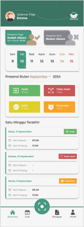- Rekapan absensi bulanan dan riwayat absensi mingguan